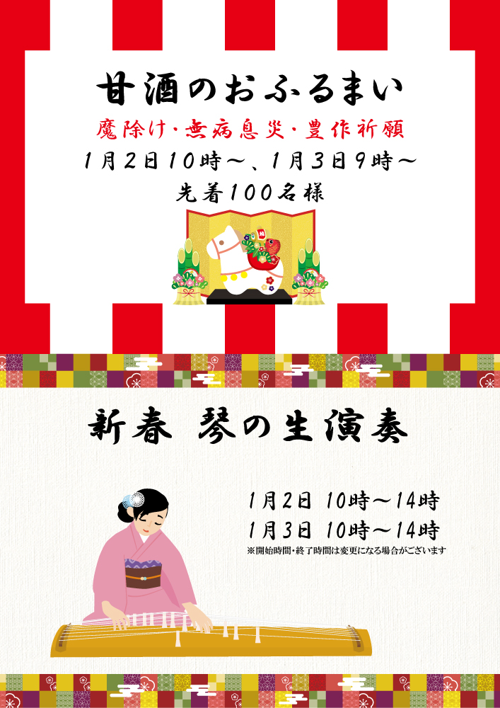 2026年の始まりは無病息災をお祈りする甘酒と心も温まる琴の音色が響く館内でゆっくりお迎えしましょう