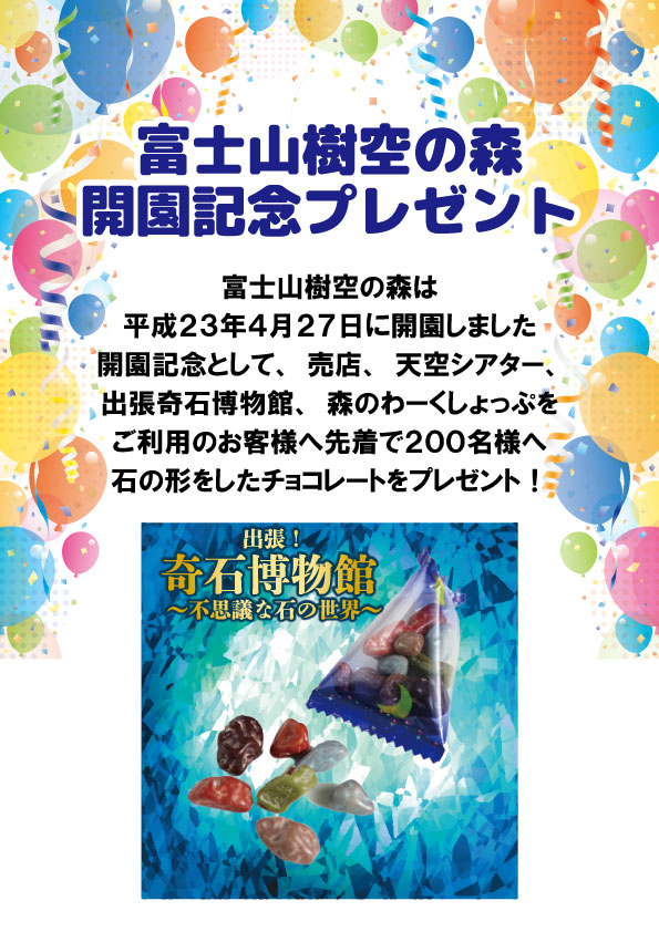 4月27日の開園記念日に先立ちまして、4月26日に、売店、富士山天空シアター、出張!奇石博物館、森のわーくしょっぷをご利用いただいたお客様へ、先着で200名様に石の形をしたチョコレートをプレゼントいたします。